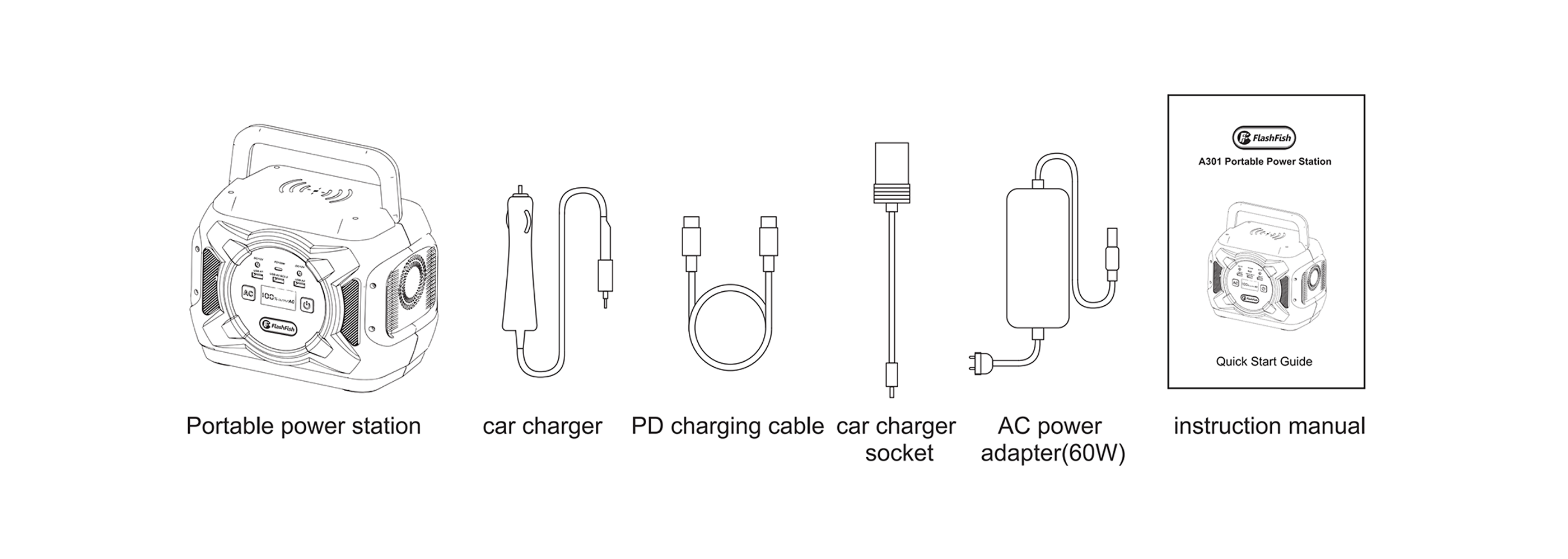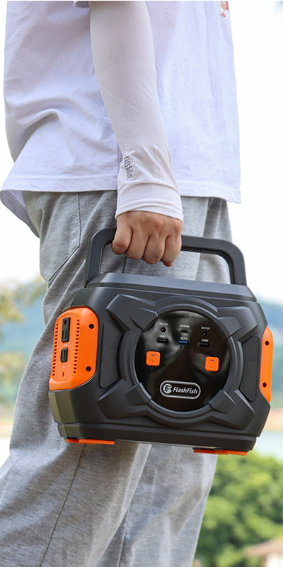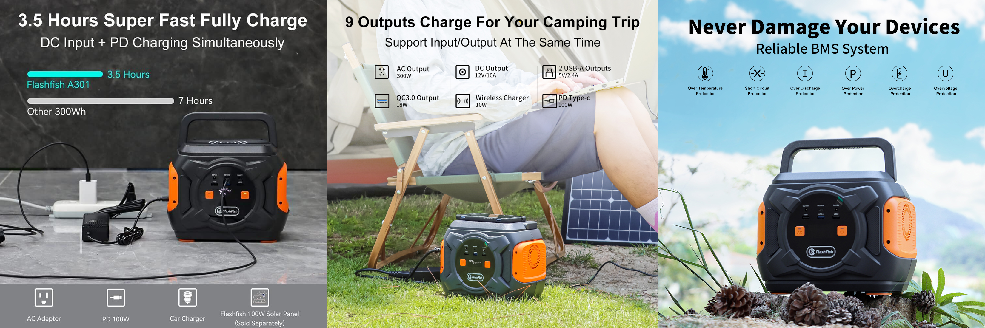 FlashFish A301 Portable Power Station, with its 320W output and 292Wh capacity, offers aversatile charging experience through 9 output ports including Ac, USB, and wireless charging.It features a fast recharge time of just 1.8 hours and includes a multi-mode LED light, making itideal for outdoor activities and emergencies. Lightweight and equipped with a smart BatteryManagement System, the A301 is perfect for travel and backup power needs.
