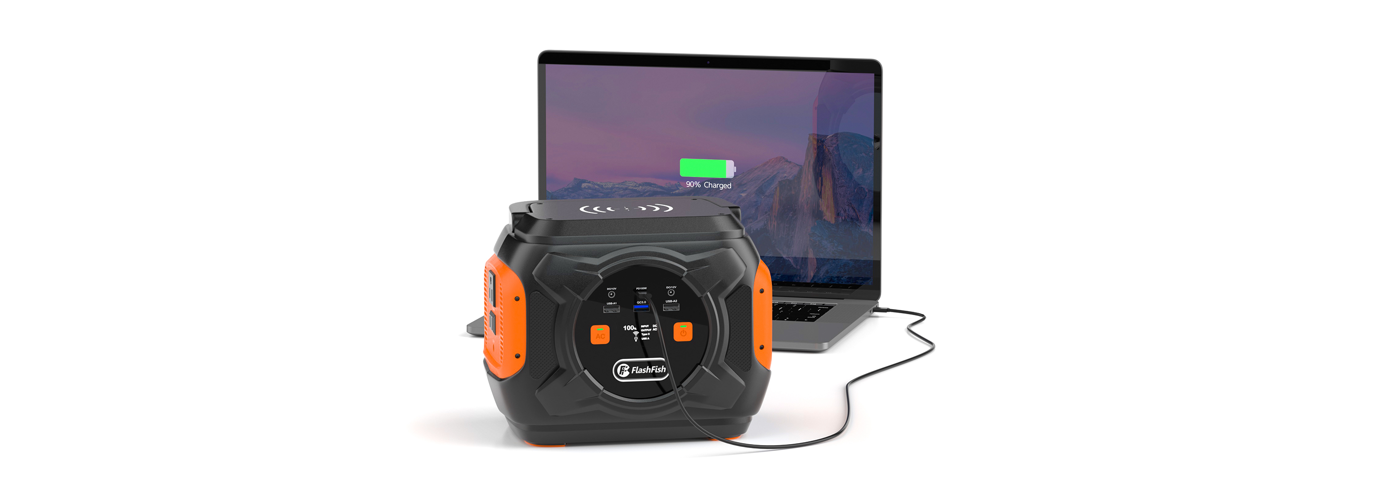 With 2 x PURE SINE WAVE AC outlets, 1 x 100W uSB-C ports, 2 x DC ports, 2 x USB-A ports.1* QC3.0 port, 1 x wireless charging pad, A301 power generator can power 8 devices at thesame time.Flashfish A301 could deliver 100W max via the PD USB-C consistently, it meansyour phone/pad/laptop will reach 80% power within half an hour.