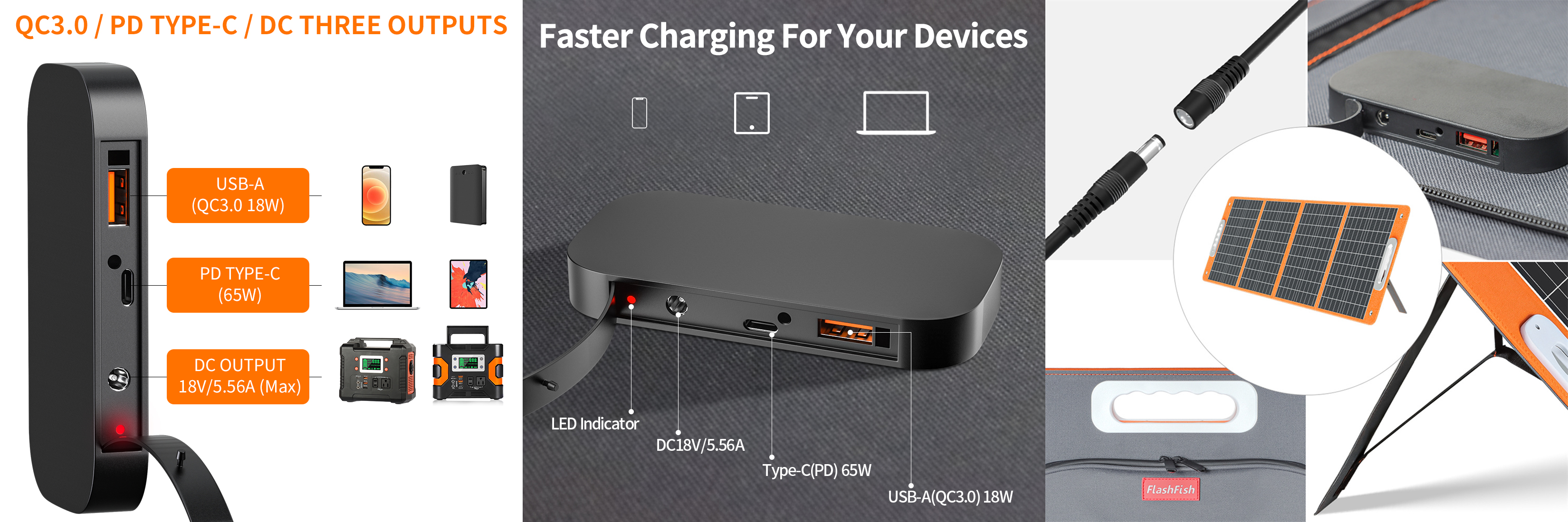 Featured with 1*USB-C(65W) and 1*USB-A(18W) output port, uSB-C port support PDcharging.Charging multiple small devices at the same time, prepare for your smartphonesand tablets(iPhone, iPad, Samsung Galaxy), GPS, digital cameras, etc.deally suited foroutdoor life and even unexpected power outages.