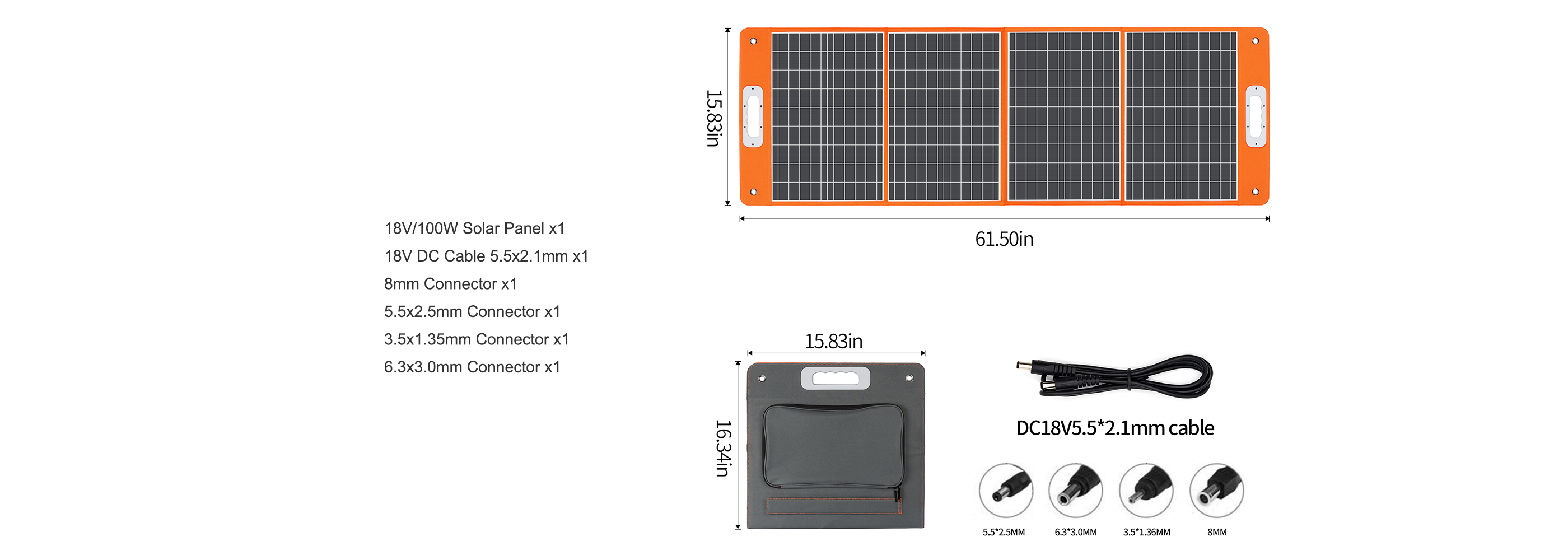 FlashFish TSP18V100W Solar Panel is a high-capacity and portable solar charging solution.With its impressive 100W output and high conversion efficiency, it harnesses maximum solarenergy for rapid device charging. The solar panel includes various connectors for compatibilitywith most solar generators, including FlashFish portable power stations. The adjustablekickstands allow for optimal positioning to capture sunlight effectively. This solar panelcombines power, convenience, and versatility, making it an excellent choice for eco-friendlyand reliable off-grid charging.