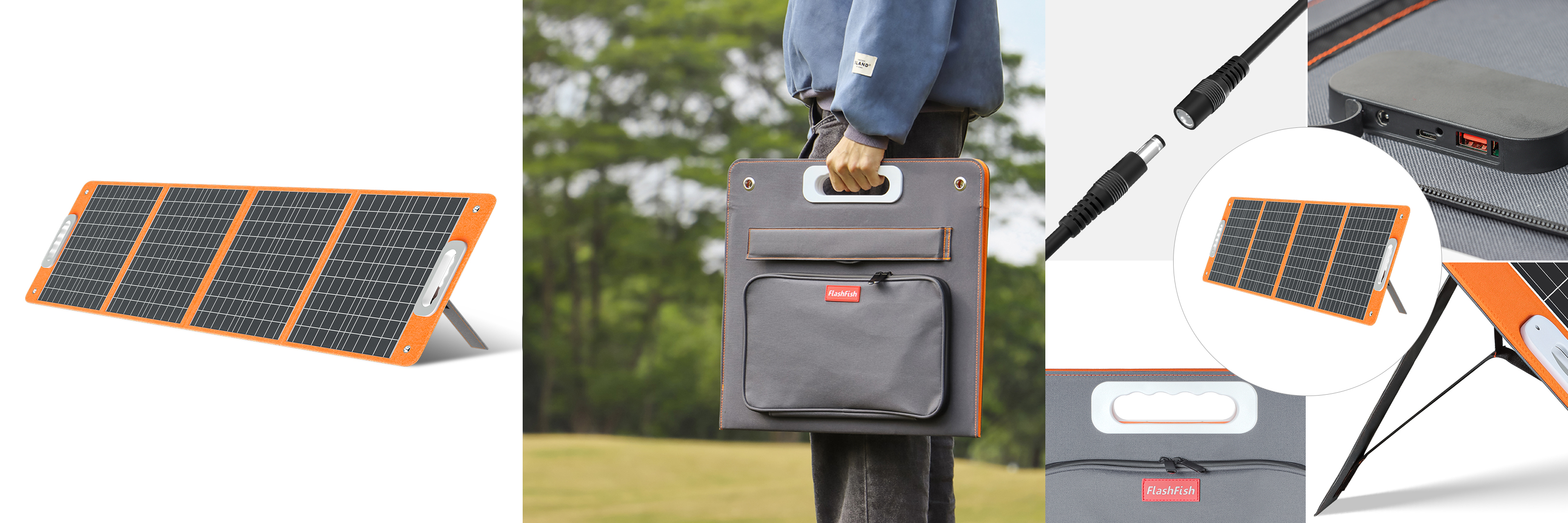 The FlashFish TSP18V100W Foldable Solar Panel offers an exceptional blend of high solarconversion efficiency and portability. lts 100W output efficiently harnesses solar energy.providing quick and reliable charging for a variety of devices. This makes the TSP18V100Wnot only a powerful solar charging solution but also a convenient and eco-friendly choice