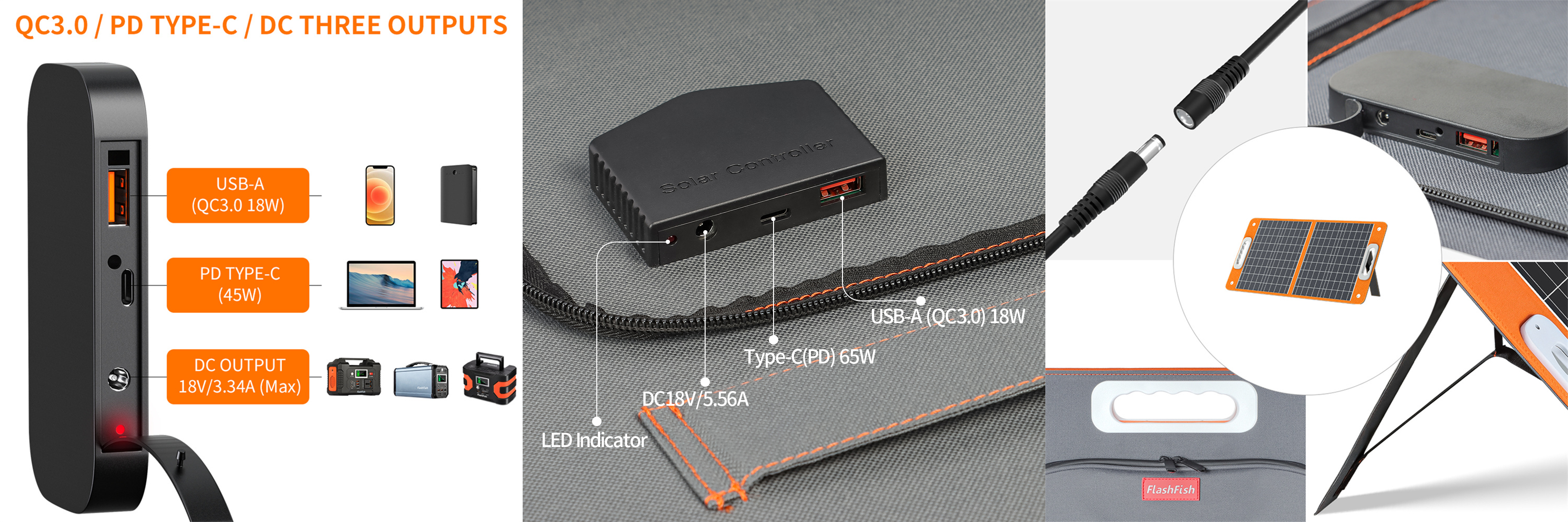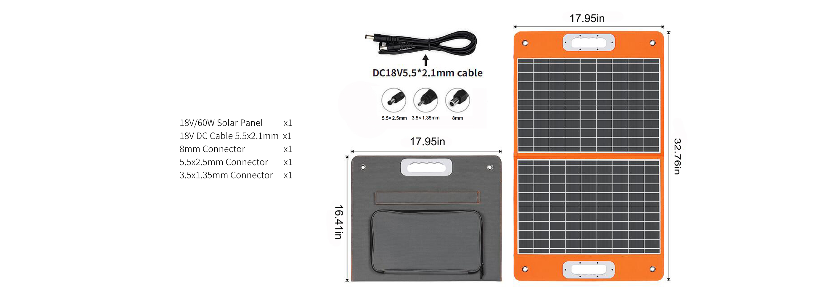 FlashFish TSP18V60W Solar Panel is a versatile and efficient solar power solution, perfect foroutdoor enthusiasts and anyone needing off-grid power. This 60W panel features high solarconversion efficiency, ensuring you get the most out of the available sunlight. lts foldabledesign makes it highly portable, ideal for camping, RV trips, or emergency use. The solar panelincludes a variety of connectors, making it compatible with most solar generators, includingFlashFish portable power stations.